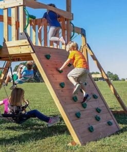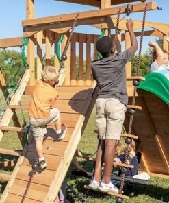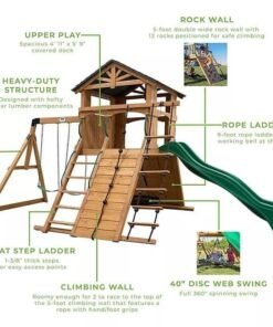 - Swing set with 4’11” x 5’9″ tree house-style covered deck