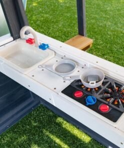 - Lower fort: a lower deck packs in ground level fun by including a snack stand and picnic table as well as a sandbox area, All combined to double as a lower wooden playhouse.