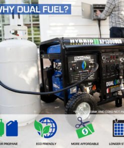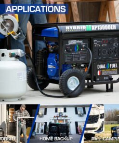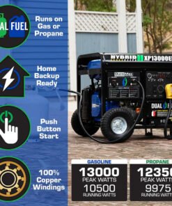 The all new DuroMax XP13000EH is a dual fuel workhorse powered by a 500cc OHV Engine and runs on gasoline or propane. With 10,500 watts of running power and the ability to surge up to 13,000 watts, this generator can power household essentials such as lights, small and large appliances, and your home’s central A/C system. The power panel has individual breakers to prevent overloading and keep everything safe.