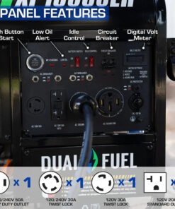 - Fully Featured Power Panel – The power panel includes a wide selection of outlets for maximum compatibility in your applications including: 2 120V household GFCI outlets, 1 120V 30A twist lock outlet, 1 240V 30A outlet, and 1 240V 50A outlet, and a 12V automotive outlet. The panel also includes a digital voltmeter.