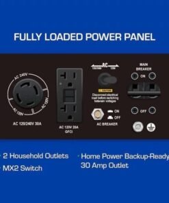 - Fully Featured Power Panel – The power panel includes a wide selection of outlets for maximum compatibility in your applications including: 2 120V household GFCI outlets, and 1 120/240V 30A twist lock outlet. The panel also includes a voltmeter and 12V DC charging posts for charging external batteries.