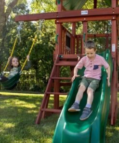 The five-star space saver ii swings set with the wood roof by gorilla playsets provides your kids jumbo-sized fun on a compact scaled swing set. This wooden playset features an alpine wave slide, a rock wall with climbing rope, a deluxe swing belt, and a trapeze swing. It even includes fun accessories such as a chalkboard kit and an interactive tic-tac-toe panel. Plus, the premium wood roof protects the play deck from weather elements and provides shade on hot days. The five-star space-saver swing set comes ready to be assembled with all required hardware, lumber, and a step-by-step instructions manual. Gorilla playsets cedar lumber naturally resists rot, decay, and insect damage. Plus, it comes pre-cut, pre-sanded, and pre-stained to help ease assembly time. Don’t miss out on big fun for all the little ones.