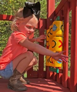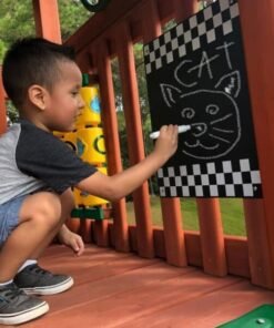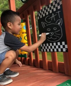 - Includes alpine wave slide, rock wall with climbing rope, belt swing, trapeze swing, built-in sandbox area, tic-tac-toe panel, chalkboard kit, steering wheel, play telescope, and flag kit.
