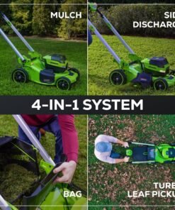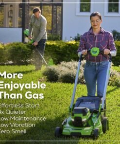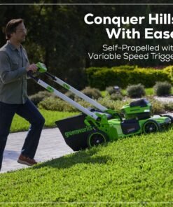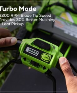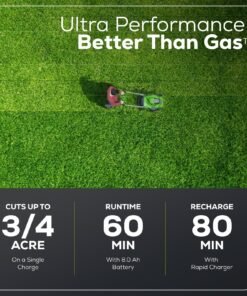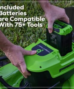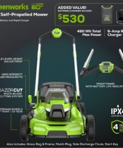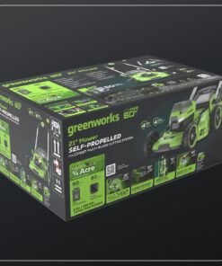 The Greenworks 60V Greenworks 60V 21″ Battery Powered Self-Propelled Mower with 8.0 Ah Battery and Rapid Charger features the most advanced power-cutting system in the industry. This innovative mower cuts up to 3/4 acre on a single charge, allowing you to effortlessly maintain your lawn without the hassle of frequent battery changes. With a runtime of 60 minutes powered by the 8.0 Ah battery, you can tackle your entire yard with ease. Thanks to the rapid charger, you can recharge the battery in just 80 minutes, minimizing downtime and keeping you productive. The folding handles of this mower allow for a space-saving storage solution, reducing the required storage space by an incredible 70%. Additionally, the Greenworks 60V mower offers outstanding performance, with 30% better mulching capabilities, 50% more power, and 60% less noise compared to traditional mowers. With its 4-in-1 system, you can choose between mulching, side discharge, bagging, or turbo pickup, giving you the flexibility to customize your mowing experience according to your preferences. Upgrade to the Greenworks 60V 21″ Self-Propelled Mower today and experience the future of lawn care technology. Includes 8.0 Ah lithium-ion battery, rapid charger. Battery is compatible with 75+ Greenworks Pro 60V products.