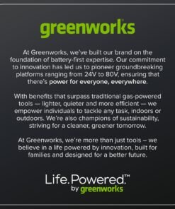 - Battery Platform: Battery powers 75+ 60V Greenworks products