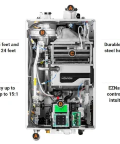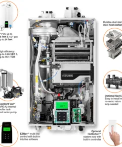 This model features Navien’s patented ComfortFlow® system with a built-in recirculation pump and buffer tank to eliminate temperature fluctuations and minimize hot water wait time. Dual stainless steel heat exchangers enhance durability, while the EZNav™ control panel simplifies setup and operation. The NPE-240A2 supports cascading with up to 32 units and common venting with up to 12, and is field convertible for natural gas or propane use. With ultra-low NOx emissions and advanced safety features, it delivers efficient performance without sacrificing reliability.