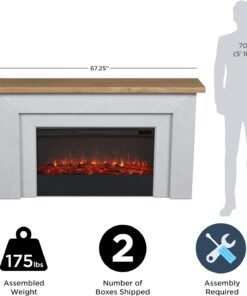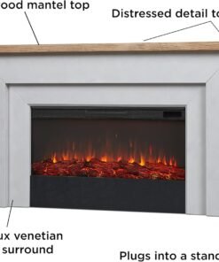 - Includes: Mantel, replaceable electric fireplace heater insert, remote control, 6 foot power cord with lay-flat plug, anti-topple safety device and hardware. One year limited warranty. Assembly required.
