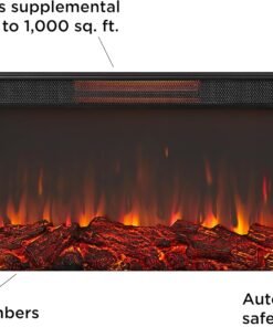 - Heater: The replaceable electric fireplace heater insert mimics the look of a real, flickering fire, but does not require a chimney or vents. Provides supplemental heat for Living Rooms, Bedrooms, Home Offices, and Dining Rooms up to 1,000 sq ft. Heat Output 5100 BTU’s.