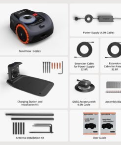 - Package Contents: The package includes 1 * Navimow i105N robotic lawnmower, 1 * power supply, 1 * extension cable, 10 * pegs to secure the extension cable, 1 * charging station and the installation kit, 1 * GNSS antenna kit, 1 * antenna installation kit, 9 * spare blades and bolts, 1 * user materials set.