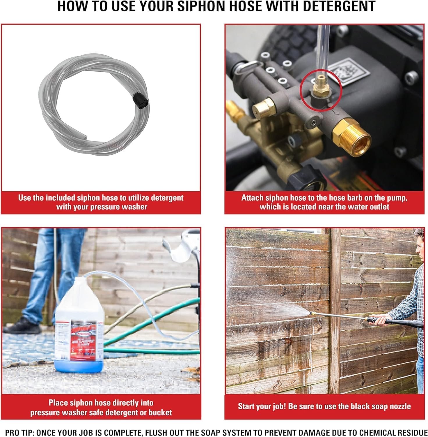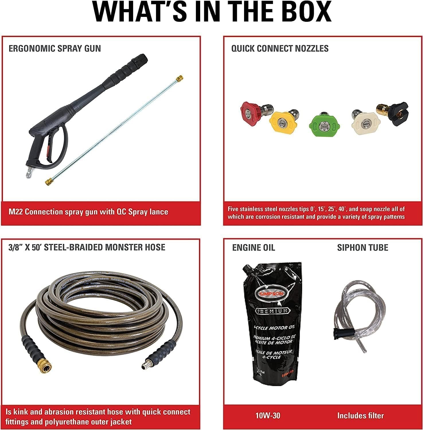 - PRO PRESSURE WASHER ACCESSORIES: Five quick-connect pressure washer tips (0°, 15°, 25°, 40°, and soap nozzle) cover tasks from stripping paint to car cleaning; Rear-load M22 pressure washer gun and 31″ spray wand included