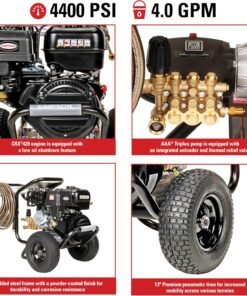 - ENGINE & PUMP: CRX420 engine starts easily and includes low-oil shutdown; AAA triplex plunger pump delivers 4400 PSI at 4.0 GPM and includes integrated unloader and thermal relief to prevent overheating; Designed for reliability and long service life