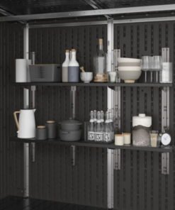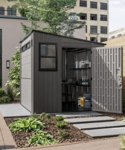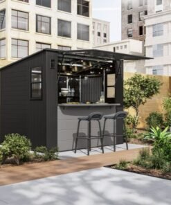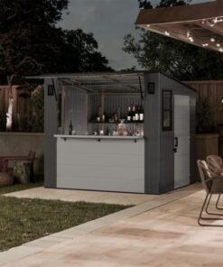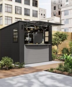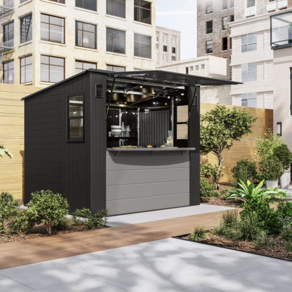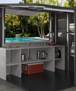 Designed to solve both your outdoor storage and entertaining needs in one ultimate storage solution, the Suncast® 8 x 7 Cabana Entertainment Shed checks all the boxes. This trend-forward design makes an attractive addition to any backyard. With 362 cu. Ft. of storage space, you can maximize your storage capabilities thanks to the included adjustable shelving, baskets, and drawer insert. When it’s time to set up for your next outdoor barbeque or gathering, the Cabana Entertainment Shed effortlessly transitions from a storage shed to a chic entertaining cabana. The sturdy split front panel transforms into a convenient canopy in seconds, providing plenty of shade to get out of the sun. This entertainment shed also includes an integrated bar top that flips down with ease, and provides an ideal spot to pull up a stool for a cool drink or snack with friends and family (barstools not included). Smart inside and out, the Suncast® 8 x 7 Cabana Entertainment Shed is the ultimate storage and entertainment solution.