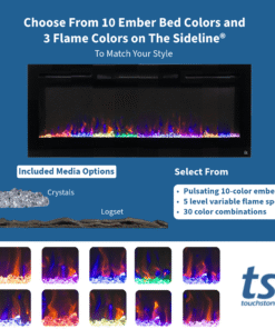 The Touchstone Sideline 50-Inch Smart Electric Fireplace (Model 80004) combines modern style, advanced smart controls, and efficient heating to create the ultimate centerpiece for any living space. Designed for recessed wall installation, it delivers the look and feel of a built-in fireplace with realistic LED flames that can be customized in multiple color combinations.